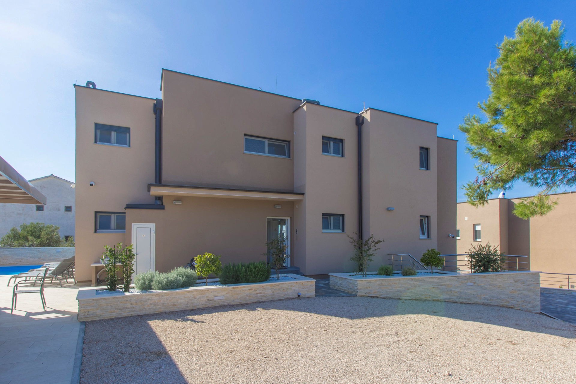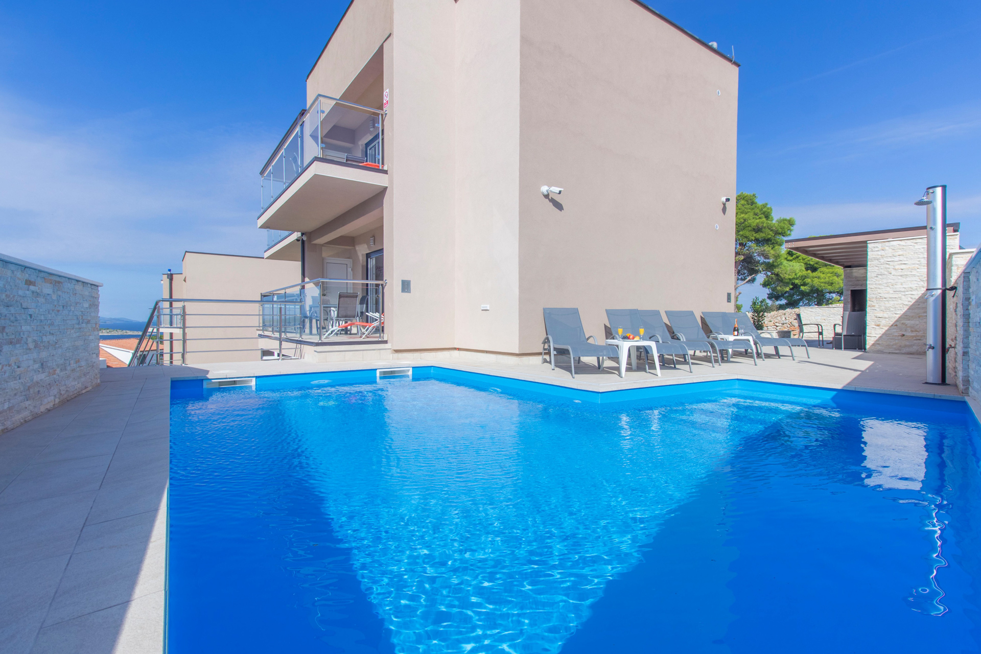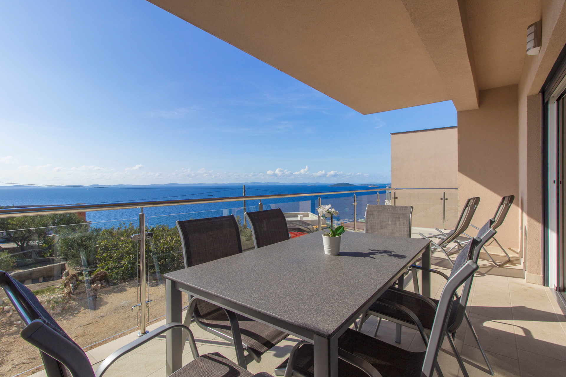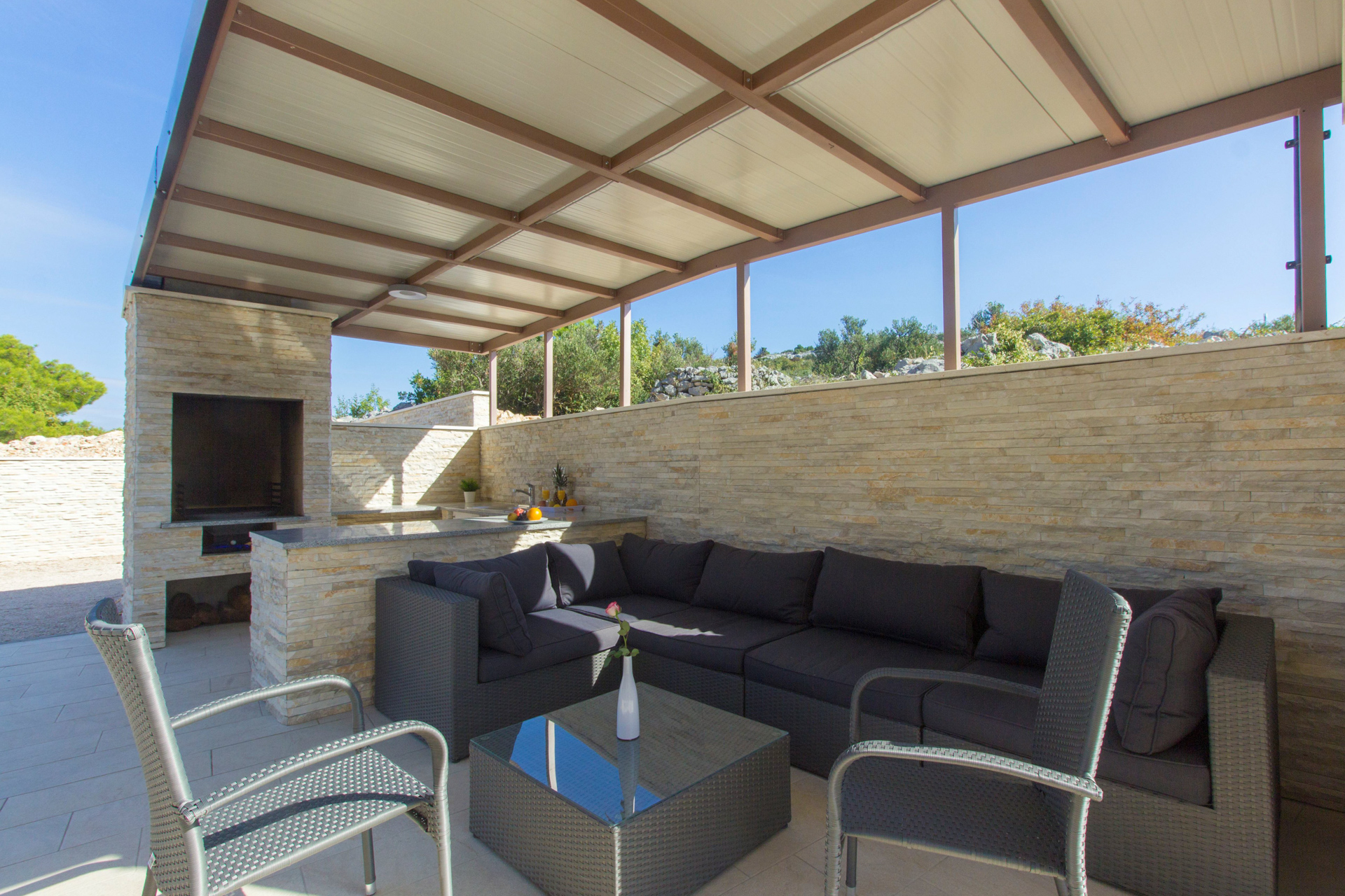 Der Garten verfügt über einen Grillplatz mit Küche, Sitzecke und Sonnenterrasse. Direkt neben dem vollautomatischen, beheizten Pool (25 m²) bietet er einen herrlichen Blick auf das Meer und den Sonnenuntergang.