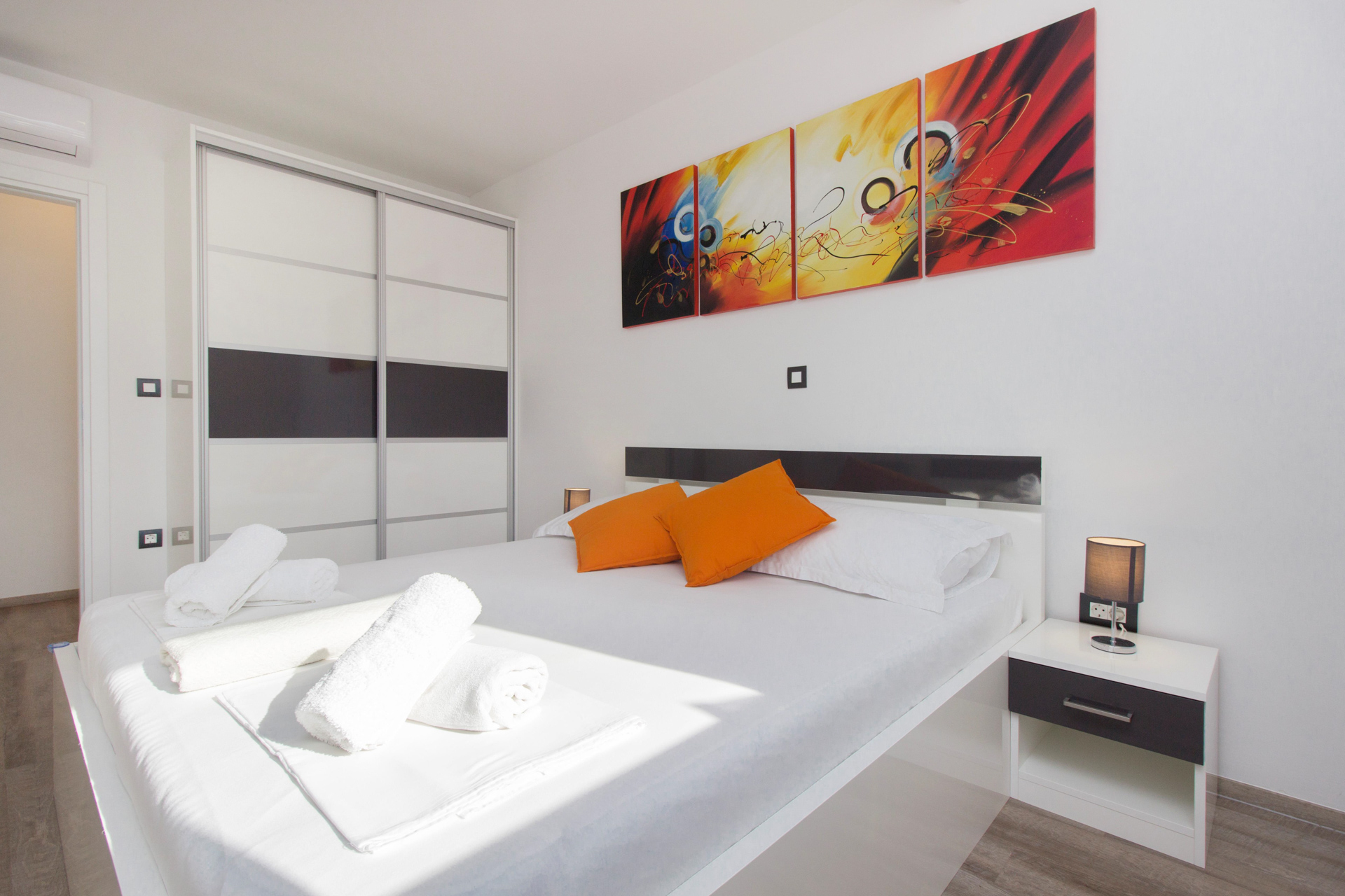 Es besteht aus zwei separaten Wohnungen, die problemlos zu einer großen Wohnung umgebaut werden können. Es gibt eine Ein-Zimmer-Wohnung mit Wohn-/Esszimmer und Küche, einem Schlafzimmer, Badezimmern und einem 15 m² großen Balkon. Darüber hinaus gibt es eine Zwei-Zimmer-Wohnung mit Wohn-/Esszimmer und Küche, zwei Schlafzimmern, einem Badezimmer und einem 28 m² großen Balkon.